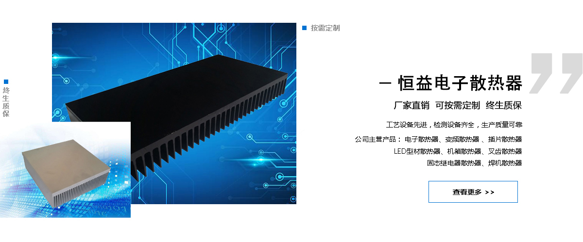 鎮(zhèn)江新區(qū)恒益電子有限公司(原鎮(zhèn)江新區(qū)電子電器廠),創(chuàng)建于2004年,是專業(yè)制造銷售“恒益”牌系列散熱器及電子、電器設(shè)備等產(chǎn)品的企業(yè)。主營 電子散熱器 、 變頻散熱器 、 插片散熱器 、 型材散熱器 、機箱散熱器、叉齒散熱器、固態(tài)繼電器散熱器、焊機散熱器 。本廠研制生產(chǎn)的"恒益"牌散熱器是電子半導體器件獲得長壽命、高效率,提高整機質(zhì)量的重要保證。散熱器系列適用于交直流電源、穩(wěn)壓電源、開關(guān)電源、通訊電源、凈化電源、廣播電視發(fā)射裝置、變頻電源、逆變電源等各種電源產(chǎn)品; 還適用于日光燈電子鎮(zhèn)流器、音響設(shè)備、功放電路、自動控制儀等電力電子產(chǎn)品領(lǐng)域。